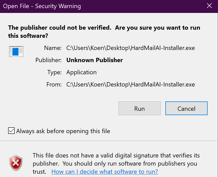 Select "Run". Unknown Publisher refers to anyone who hasn't paid off the certificate authorities (hundreds of dollars per year!).